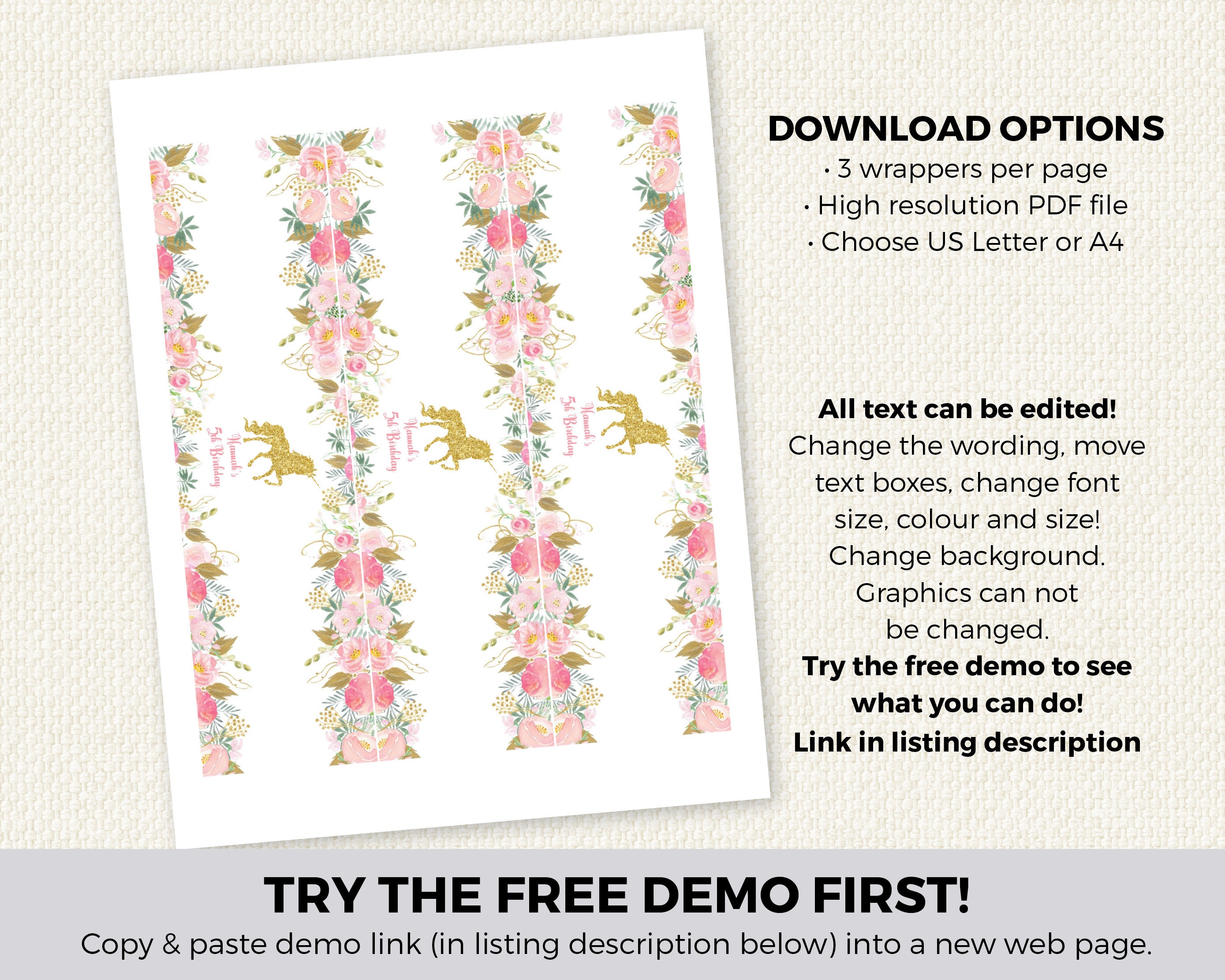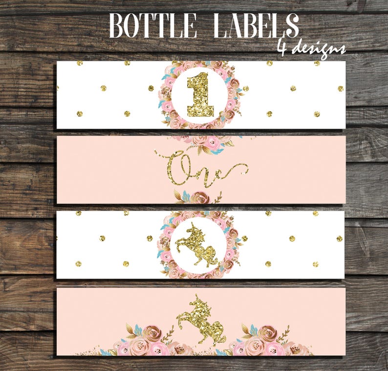 Unicorn Party Water Bottle Labels - (Only Unicorn) INSTANT ... This listing contains a US letter (8.5 x 11 inches) size PDF file with FOUR 8.5 x 1.8 in. Unicorn Party Printable Bottle Labels / Napkin Rings (Just the Unicorn Labels) that you can personalize at home using Adobe Reader, to print at home or at a print shop.Please keep in mind that no printed materi