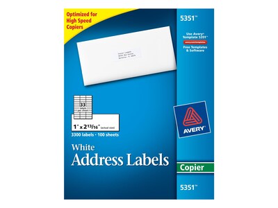 Avery® Copier Address Labels - 1 3/8" Width x 2 13/16" Length - Permanent Adhesive - Rectangle - White - Paper - 24 / Sheet - 100 Total Sheets - 2400 ...